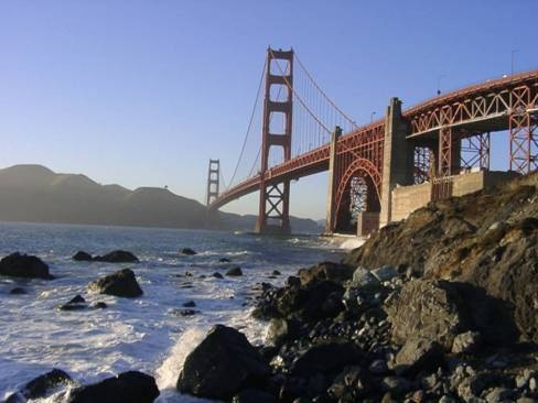 Nach kurzem Burger-Frühstück ging’s durch die San Francisco Cannery zurück zur Fishermen´s Wharf und von dort auf den Weg zur Golden Gate Bridge. Es ist ein ganz schöner Fußmarsch, aber wirklich lohnenswert. Der Wind war so stark, dass die Surfer wirklich beste Konditionen hatten und die Brücke vollkommen klar zu sehen war (na ja, etwas dizzy, aber das ist hier ja normal). Eine gute Stunde später waren wir dann auch schon an der Brücke, ich glaube in der Zeit hätte man locker nach Alcatraz hinüber schwimmen können, mehr als 800 Meter können das eigentlich nicht sein. Die Vorbereitungen auf den July 4th scheinen im übrigen doch ihre Schatten voraus zu werfen. Auch wenn in der lokalen Zeitung zu lesen war, dass San Francisco keine besonderen Vorbereitungen bezüglich Sicherheit vorgenommen hat, so war die US Army am Fuße der Bridge am patrouillieren und Hubschrauber kontrollierten regelmäßig die Brücke aus der Luft. Uns egal, wir sind weiter zum Aussichtspunkt und von dort auf die anderes Seite der Brücke. Für Fotos ist diese Position aber etwas ungünstig, weil der Weg sehr weit oben und nicht wie erfreulich direkt am Wasser entlang führt. Was nicht ist, kann ja werden und so sind wir die steilen Abhänge und Klippen bis ans Wasser heruntergeklettert. Beinahe noch von den riesigen Wellen von den Steinen gespült war die Aussicht von hier wirklich einmalig, einfach genial!