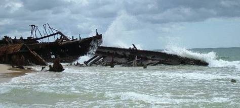 Danach sind wir die Küste in Richtung Norden gefahren, zum Maheno Schiffswrack. Dies ist ein bereits halb versandetes Wrack, welches dort seit zig Jahren liegt. Es gehörte den Australiern, die es an die Japaner verkauft haben. Als sie es nach Japan überführen wollten, haben sie diesem Schiff die Schrauben ausgebaut und wollten es schleppen. Dann kam jedoch ein Sturm auf und das Abschleppseil ist gerissen. Daraufhin ist das Schiff nach Fraser Island getrieben und gestrandet.