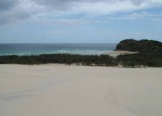 Nächstes (geplantes) Highlight unserer Tour war denn die große Sanddüne – direkt hinter dem Hindernis. Hier durften wir zu Fuß rauf wandern – von oben hatte man einen sehr schönen Ausblick auf die nord-östliche Bucht von Fraser Island. Der Aufstieg war zwar wieder ein wenig erschwerlich, weil sandig, hat sich aber gelohnt, als man oben drauf gestanden hat. Und das tolle daran war: Der Sand war so hell und so weiß, dass wir in Australien wenigstens mit ruhigem Gewissen behaupten können, wir hätten eine weiße Weihnacht gehabt J!