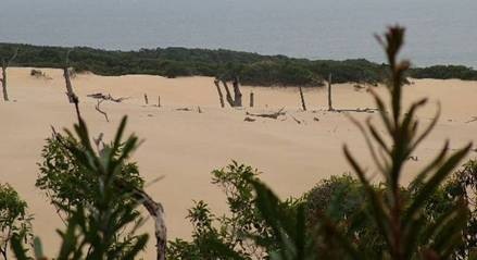 Danach ging es noch einmal weiter zu einem anderen Lookout, runter vom „Highway“, hinein in die Berge. Hier hatten wir einen schönen Blick auf eine Sanddüne, welche durch den Urwald wandert und mittlerweile vom Sandstrand abgetrennt ist.