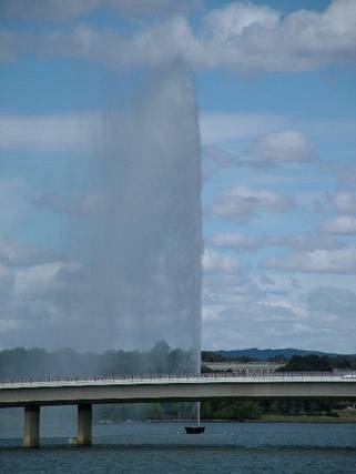 Reihenfolge und Aufbau), aber es war ja kostenlos und irgendwie nett anzuschauen. Auf drei Ebenen wurde uns also Australien, seine Geschichte und seine Symbolik dargestellt. Aber nach ca. einer Stunde hatten wir alles angeschaut und wollten wieder raus an die frische Luft. Vom Balkon des Museumscafes haben wir dann auch den Springbrunnen gesehen und diesmal an…. juchuh. Die Leute aus dem Museum haben uns dann noch gesagt, dass diese Fontäne zweimal am Tag eingeschaltet wird, natürlich immer dann, wenn wir nicht da sind bzw. das nicht sehen können…. Die Zeit reichte dann auch nicht mehr, um wirklich nah hinfahren zu können, weil in einigen Minuten das Wasser abgestellt wird…. Pech gehabt.