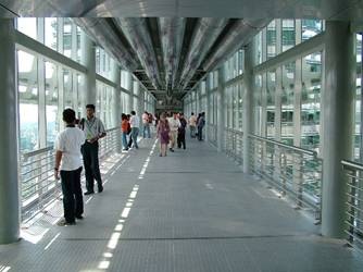 Ist schon ein tolles Gefühl, auf so einem Gebäude zu stehen und in die Tiefe zu schauen, auf den angelegten Park und den Rest der Stadt. Die Aussicht an sich war nicht wirklich sooo toll, das haben wir aber auch schon früher gewusst. Von dieser Brücke konnten wir nicht wirklich auf die Stadt schauen, da die beiden Türme die Sicht verdeckt haben. Aber gut, hat ja auch nichts gekostet.