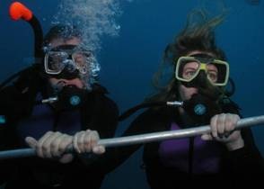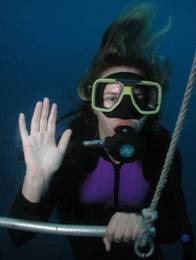 Danach sollten wir erst einmal eine kleine Weile an der Oberfläche direkt hinter dem Boot schwimmen, um uns an das Atmen zu gewöhnen. Irgendwie total komisch – das ist nichts anderes als Schnorcheln gewesen, nur hatte ich doch eine Art Panik verspürt. Diese ist dann aber nach ca. 2 Minuten vergangen und wir sind mit dem Tauchlehrer zusammen an einem Gerüst, welches am Boot angebracht war, auf zwei Meter hinab getaucht.