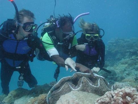 Ich weiß nicht genau, was mich geritten hat, aber ich habe zum Angebot erst einmal „Ja“ gesagt. Als ich Sabrina dann davon erzählt habe, meinte sie zu meiner kompletten Überraschung, „Ok, dann probier ich das auch mal!“ Damit hab ich mal gar nicht gerechnet, schon eher, dass sie sagt, dass sie es sich noch einmal überlegt, als der Lehrer mit einem Schreiben vorbei kam, was wir ausfüllen müssen von wegen ob wir auch gesund sind und so. So ein Blatt auszufüllen, bei Seekrankheit, ist nicht ganz so einfach! Aber ich habe das mal zum Großteil ausgefüllt und ehe wir uns versahen, haben wir schon am Riff geankert, saßen am Ende des Boots und hatten jeweils ca. 30 Kilo auf dem Rücken und auf den Hüften (damit wir auch ganz sicher absaufen werden).