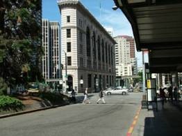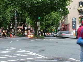 Nachdem unser Abendessen nun fast weg geflossen ist, brauchten wir eine Alternative. In vager Erinnerung meinte ich, dass wir in dem etwas älteren Teil von Seattle (Old Town? oder so) nett essen gehen könnten. Also haben wir uns auf den Weg durch die Schluchten der Hochhäuser gemacht, um dann in der Nähe des Hafens auf Parkplatzsuche zu gehen. Wir hatten an diesem Tag ja schon fast 20 US$ fürs Parken gezahlt, da war ich nun gespannt, wir teuer die nächsten zwei Stunden werden sollten. Die ganzen Automaten auf den offiziellen Parkplätzen sprachen von ca. 5-8 $ pro Stunde und ich hab mich schon damit abgefunden, heute zu hungern… Irgendwo habe ich dann einen Parkplatz an der Straße gefunden und hab den Wagen dort eingeparkt. Zur kompletten Überraschung mussten wir jedoch ab 18h nichts mehr zahlen. Meine Kreditkarte wurde auch verweigert. Schilder standen nirgendwo. Also bin ich zu irgendeinem Auto gegangen, in welchem eine Person saß und habe ihn zu diesem Thema interviewed. Er hat mir bestätigt, dass wir dort stehen bleiben können, also haben wir uns auf einen kleinen Fußweg gemacht und auch einige nette Restaurants gesichtet.