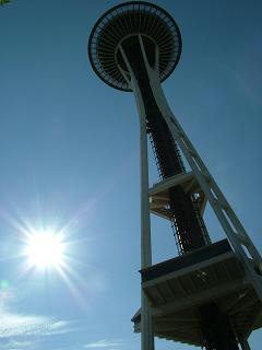 Die Aussicht war phänomenal! Die Sicht war so klar wie noch nie – wir konnten die Skyline sehen und im Hintergrund den 90 Meilen (ca. 150 km) weit entfernten Mt. Reiner mit seinen ca. 4.500 Metern Höhe. Wir haben – falsch, ich habe – den ganzen Studenten zugehört, die im Namen der „Space Needle“ (Firma) einige Vorträge zur Umgebung gehalten haben. Das war recht spannend, denn nun weiß ich auch genau, wo das „Schlaflos in Seattle Bootshaus“ steht, Redmond genau liegt, wie hoch die Berge sind, mit welcher Abschlussnote die Studenten welche Fächer belegt haben, dass alle derzeit noch Arbeit suchend sind…