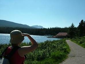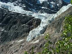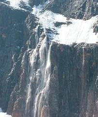 Diesen Weg sind wir nur für einige hundert Meter eingeschlagen, da er danach in einen Wald (mit vielen Moskitos) führte. Von dort oben konnten wir einen lawinenartigen Wasserfall beobachten. Hinter dem Eis auf dem Gletscher von Mt. Edit Cavell hat sich anscheinend eine Wasserhöhle gebildet, die plötzlich geplatzt ist und als Wasserfall hinunter gekommen ist. Diese immensen Wassermassen sind dann ca. 400-700m nach unten geknallt und in den dort schon vorhandenen See geflossen.