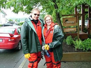 15 Minuten später saßen wir beide also mit unseren neuen Regenjacken am Treffpunkt zu unserer Tour, bekamen sehr nette, rote Regenbekleidung mit und wurden zu unserem Zodiak geführt.