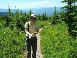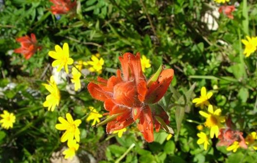 Um zu dem Ausgangspunkt unser geplanten 45min. Wanderung entlang des Trophy Mountain Meadow Trails zu gelangen, mussten wir erst einen 15km langen Schotterweg fahren… Das war gar nicht so witzig und unser Auto sah echt aus wie eine Dreckschleuder… richtig schön braun. Oben angekommen, waren wir schon ca. 1.690m hoch und hatten einen sehr schönen Ausblick auf den Park und die Berge dahinter. Vor uns lag ein schöne blühendes Feld, eben das Flower Meadow, für das dieser Platz sehr bekannt ist. Natürlich haben wir uns vor der anstehenden Wanderung ordentlich mit unserem „Anti-Mücken-Zeugs“ OFF eingesprüht, denn wir wollten eigentlich keine weiteren Stiche mehr abgekommen….