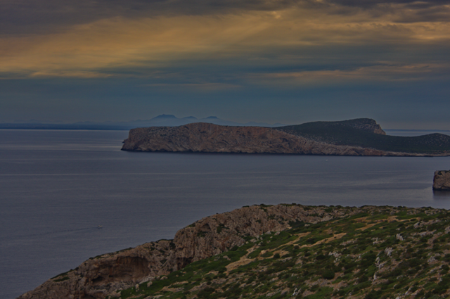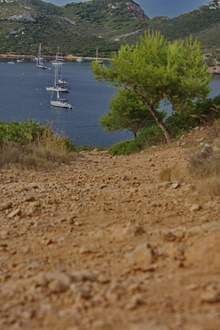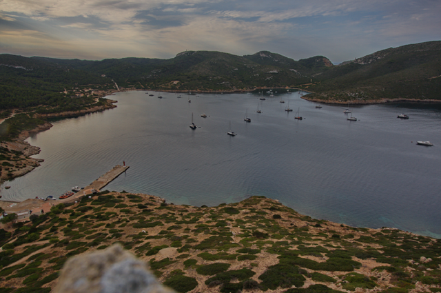 Oben angekommen eröffnet sich ein sehr schöner Blick auf die Bucht von der Isla Cabrera mit den ganzen Segelbooten. Das Wetter ist nicht ganz so optimal, über Mallorca liegt eine etwas dickere Wolkendecke. Zum Glück geht hier oben allerdings ein wenig Wind, so dass man die feuchte Luft hier besser ertragen kann. Auf dem Rückweg zum Boot kommt uns dann der Rest der Pöbel-Crew entgegen. Sebi’s geniale Idee, wir kommen noch einmal mit nach oben wegen einem Crew-Foto wird gemeinschaftlich abgelehnt. Das Foto gibt’s also auf halber Höhe. Zum Glück hatte ich mein Stativ dabei.