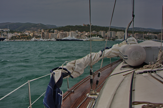 Ich warte auf Signal vom Hannes und lasse das Segel langsam runter. Die beiden legen das Tuch zusammen und ich lasse immer mehr runter. Das Segel beruhigt sich. 50% sind nun schon unten. Das Tuch wird um die Backbord Reling gewickelt. Es fehlen Bensel zum Festbinden. Egal, sichern können wir später. Hauptsache, das Segel ist gleich unten. 75% nun schon. So langsam beruhigt sich die Lage. Das Segel ist eingeholt, wir fahren nun komplett unter Motor.