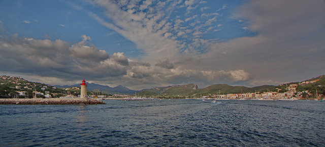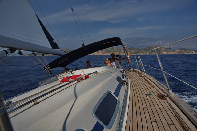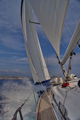 Mit nur einem Schlag kommen wir bereits in die Landabdeckung vor Andratx. Wir entscheiden uns noch einmal, raus zu fahren, um noch einige Kreise zu segeln. Halsen und Wenden "üben". Gut, ich muss gestehen, bei nur noch einem Tag auf dem Boot ist "üben" ein wenig übertrieben. Bei der ersten Halse, die wir mit beiden Segeln fahren, stelle ich fest, dass der Platz an der Großschot einer der stressigsten ist. Dauernd "dicht holen" und wieder "auffieren"… Aber wirklich spaßig!