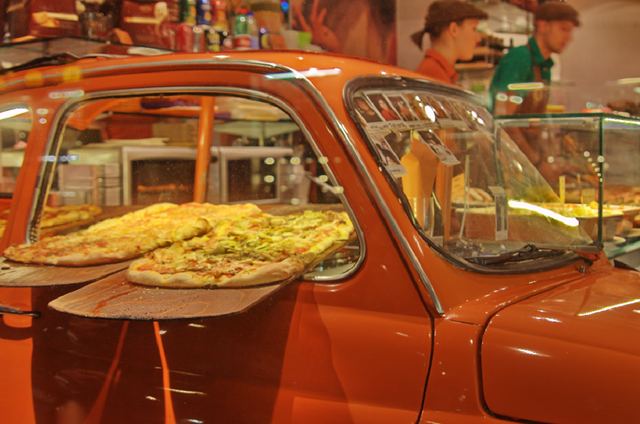 Wir entdecken einen kleinen Italiener, der die Pizza sehr elegant in dem Mini Laden präsentiert. Und oben im Lädchen kann man sich hinsetzen und essen. Das spricht uns so an, dass wir unsere Essens-Pläne über ’n Haufen werfen und hier einkehren. Wir werden auch nicht enttäuscht. Die Pizza ist überdurchschnittlich lecker! Gegen 18.30h müssen wir allerdings schon wieder den Heimweg anbrechen. Caro und Timo haben Theater-Karten.