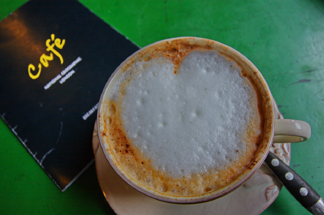 Wir kommen im Cafe an. Der Platz ist in der Tat noch frei. Wir quetschen uns an 12 anderen Touristen vorbei, die warten wohl schon länger (gemessen am Aggressivitäts-Level). Wir setzen uns und werden maximal von Caro und Timo begrüßt. Von der Bedienung keine Spur. Auch die nächsten Minuten kommt niemand. Der Laden absolut idyllisch, klein und fein eingerichtet. Draußen zig Leute, die rein wollen. Drinnen bedient niemand. Komisch. Irgendwann machen wir auf uns aufmerksam. Und bestellen. Bis der Cappuccino kommt, dauert es wieder eine Ewigkeit. Der Kuchen kommt dafür überraschend schnell…