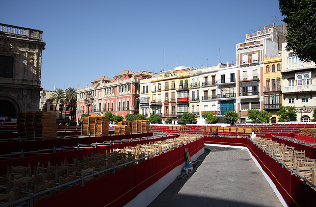 Aber was soll das Gejammer: wir haben’s schließlich überlebt. Und das ohne nennenswerte Blessuren oder ähnliches. Einzig wird die Konzentration von der schönen Architektur umgelenkt auf den Gehörsinn – und das ist ein wenig schade. Wir laufen also weiter durch die Altstadt, El Centro. Dabei entdecken wir am Plaza Nueva einen Nespresso Store und ich bin überglücklich, wieder einmal einen ordentlichen (N)Espresso genießen zu können. Direkt nebenan verläuft auch die Avenida de la Cónstitution. Diese Straße und die Plätze drum drum werden gerade schon vorbereitet für die Semana Santa, die Kar-Koche. Überall werden Tribünen aufgebaut. Dies verengt die Straßen natürlich ungemein. Die Menschenmassen schieben sich durch die Mitte oder am Rand entlang. Wir sind kurzfristig sehr froh, nicht in der Kar-Woche selbst in der Stadt zu sein – das wäre vermutlich die Hölle.