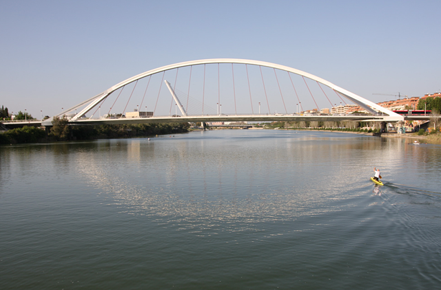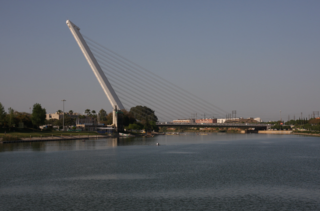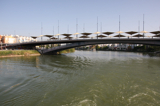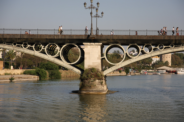Direkt Gegenüber der Arena startet nämlich unsere Schiffsreise (also besser Bootstour) über den Guadalquivir. Erst geht es kurz in Richtung Süden, entlang dem Park ‘Maria Luisa’, und dann komplett an Sevilla vorbei in Richtung Norden. Sehr interessant zu sehen sind die unterschiedlichsten Brücken. Teilweise sehr alt und von einem Schüler von dem berühmten Hr. Eifel erbaut, teilweise erst zur Expo im Jahre 1992.