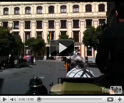 Der Weg ist ganz interessant. Er führt uns quer durch den Park ‘Maria Luisa’ und dann durch den spanischen Berufsverkehr. Wir passieren Kreisverkehre, hupende Autos, laute Moffas und ich muss sagen, ich habe schon ein wenig Respekt davor, dass der Gaul vorne vorm Gespann nicht gleich durchgeht. Der Kutscher ist allerdings recht gelassen, und das beruhigt mich. Ein wenige später passieren wir die engen Gassen der Innenstadt. Ich erkenne die Mauer des Alcazár und kurz darauf auch die Kathedrale. Hier endet unsere Fahrt dann auch schon. Die versprochenen 45 Minuten kommen mir dann doch etwas kurz vor…