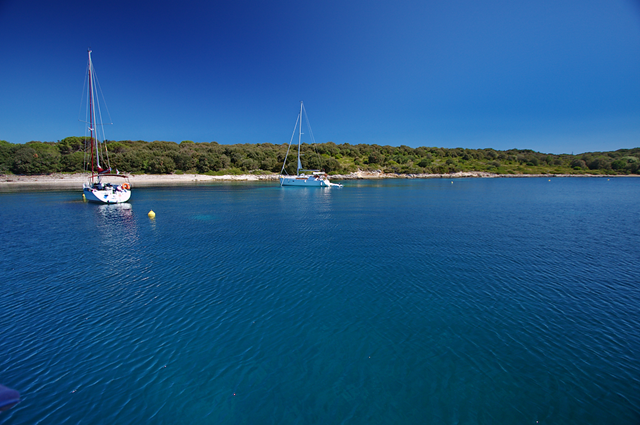 Ich kann machen, was ich will. Schon wieder endet meine Nacht mit den ersten Sonnenstrahlen, die meine kleine Luke der Kajüte treffen. Es ist 7.00 Uhr und ich versuche diesmal nicht wieder einzuschlafen sondern begebe mich direkt an Deck (bin ja lernfähig). Das Wetter in der Bucht ist mal wieder traumhaft. Es weht kein Lüftchen, die Sonne steht bereits höher als gedacht und das Wasser ist spiegelglatt. Ich kann direkt auf Grund sehen. Die helle Leine der Boje setzt sich sehr schön von dem dunklen, grasbewachsenen Boden ab. Der weiße Betonklotz wirkt enorm groß.