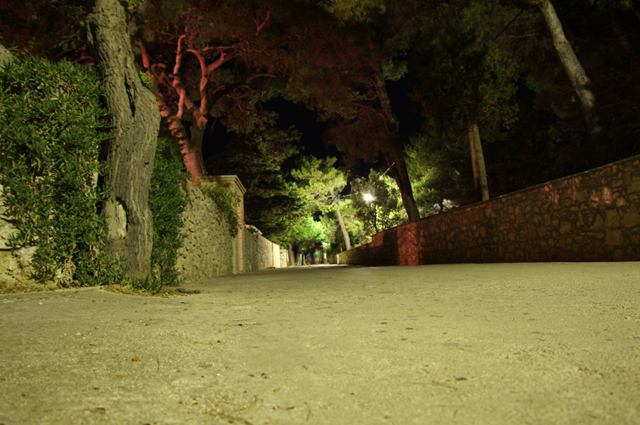 Bevor wir uns in Richtung Silba aufmachen, gibt’s an Bord noch gefühlte 2kg Pasta. Der Weg in die Stadt führt uns ca. 20 Minuten lang über einen Trampelpfad, quer durch den Wald und über die Insel. Wir werden von schön beleuchteten Restaurants empfangen. Direkt im Zentrum der Stadt, gleich neben dem Kirchturm entdecken wir eine Eisdiele. Ungeachtet der Pasta bestellen wir Banana-Splits und Amarena-Becher etc. Danach schaffen wir es allerdings nur noch, ein paar Gassen durch die Stadt – bzw. das Dorf – zu rollen. Die Gassen sind sehr schön beleuchtet und schaffen ein angenehmes Ambiente.