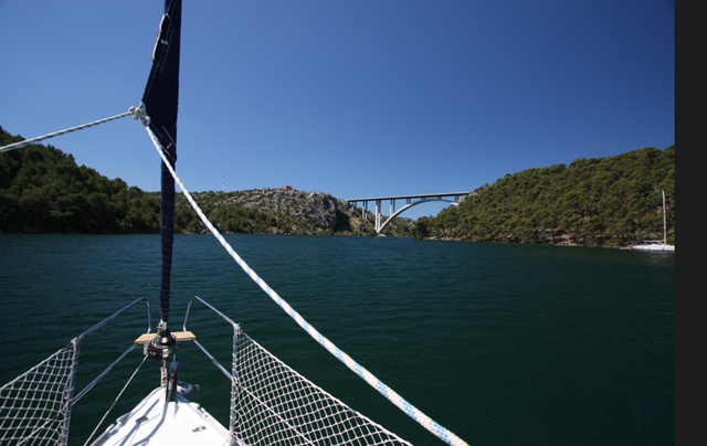 Das Auslaufen und die Passage durch das fließende Gewässer sind unsere ersten Seemeilen an Bord. Ein tolles Gefühl. Ich beweg mich in Richtung Bug und genieße den Ausblick. Als aller erstes passieren wir die Autobahn-Brücke von Skradin, ca. 49m hoch. Anschließend geht es durch einen kleinen See, weiter flussabwärts bis nach Sibenik.