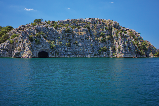 10 Minuten später verlassen wir den Fluss und passieren die Mündung in die Adria. Dabei passieren wir zwei Uboot-Bunker uns andere Festungen. Die stammen alle aus dem Bürgerkrieg 1991, vor gut 20 Jahren. Ich finde das ganz schön krass, dass hier vor so kurzer Zeit im damaligen Jugoslawien Krieg herrschte. Gut, dass diese Zeiten vorbei sind.