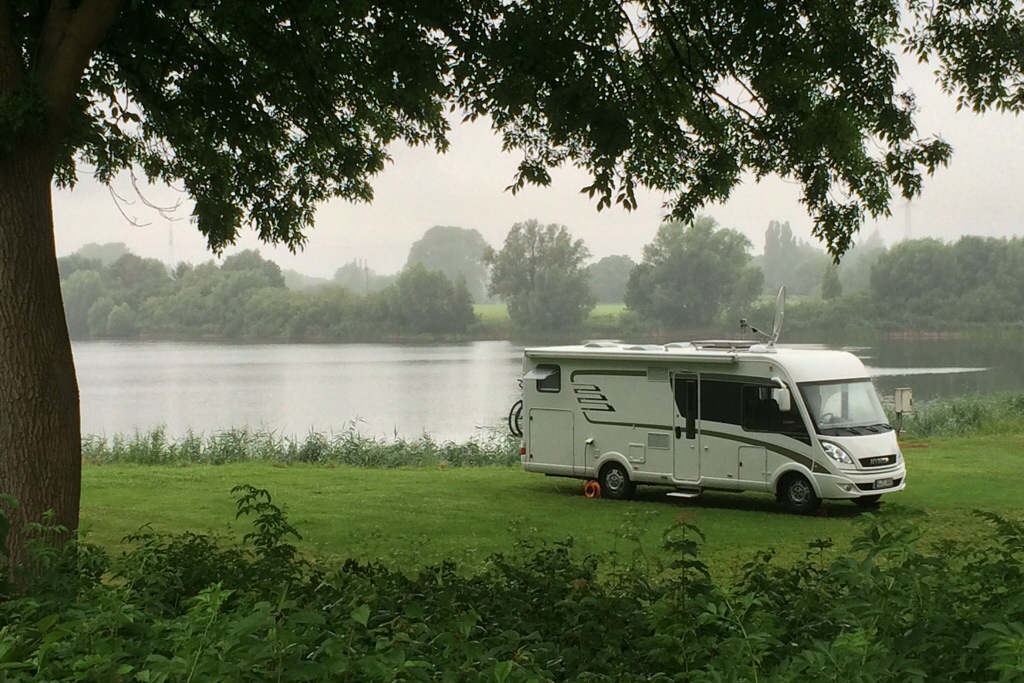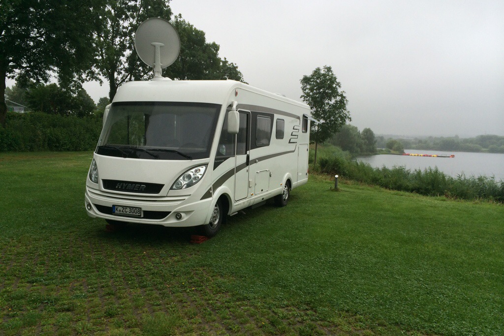 Leider regnet es wie Sau. Der Besitzer ist leicht gefrustet. Der Platz ist wie leergefegt. Durch die WM ist Es hier ohnehin eher leer. Zudem der Regen… Da bis auf sehr wenige Camper-Kollegen alle abgereist sind weist er uns einen der schönsten Plätze zu, direkt am See gelegen.