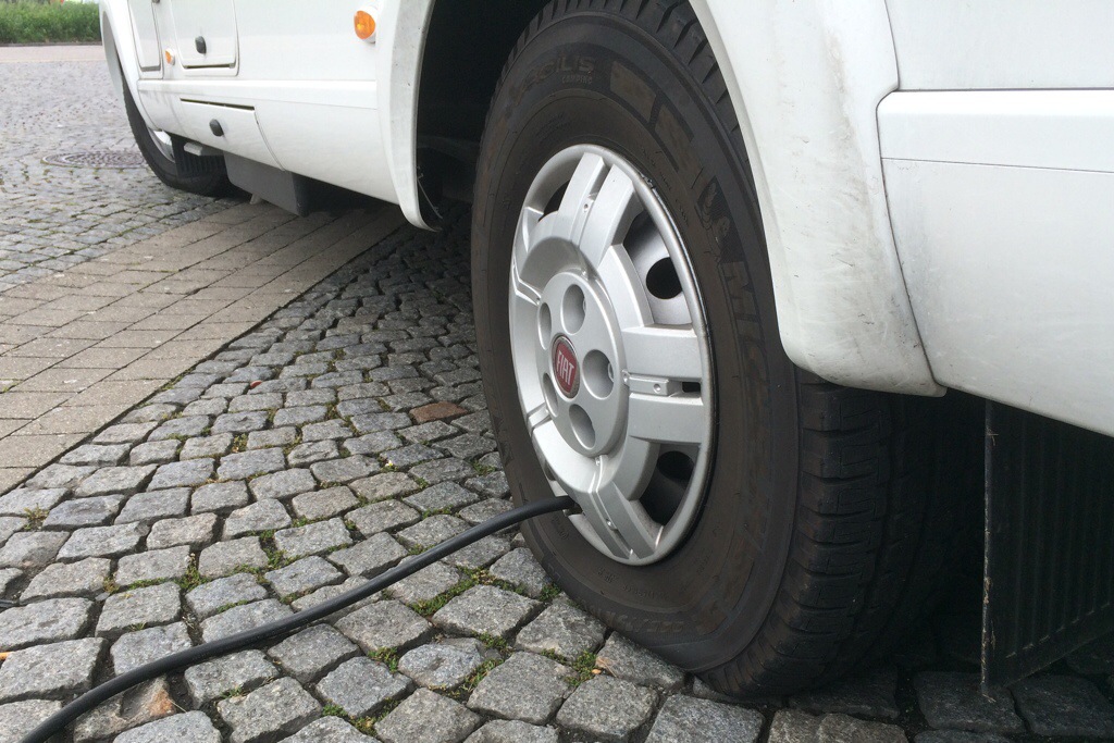 Was ich da sehe, kann ich nicht glauben. Der Reifen hinten links fast komplett leer. Also platt. Schnell Luft rein, aber ich höre schon das Zischen. Keine Chance, mehr als 2 Bar dort rein zu bekommen. Sicherheitshalber kontrolliere ich die andere Seite. 6 Bar. Mist. Sabrina gibt schon dem Vermieter bescheid. Wir sollen den ADAC anrufen.