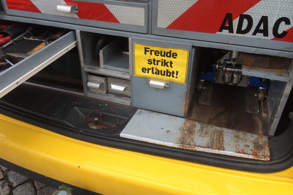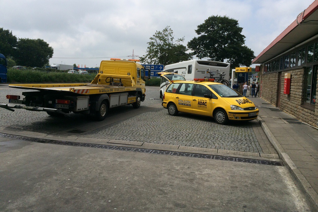 Die Jungs lassen sich gut eineinhalb Stunden Zeit. Und kommen gleich zu zweit. Einer, der den Reifen von hinten nach vorne wechselt, ein anderer mit einem Schlepper, der mich in die nächste Werkstatt schicken will.