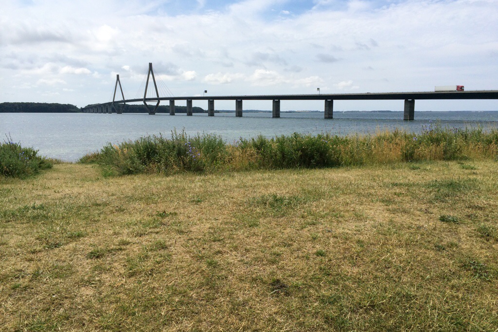 60km vor Rødby überlegt er sich dann doch mal, die Augen zu öffnen. Zeit für eine Pause. An einem schönen Rastplatz auf der kleinen Insel Farø. Im Hintergrund die Autobahnbrücke.