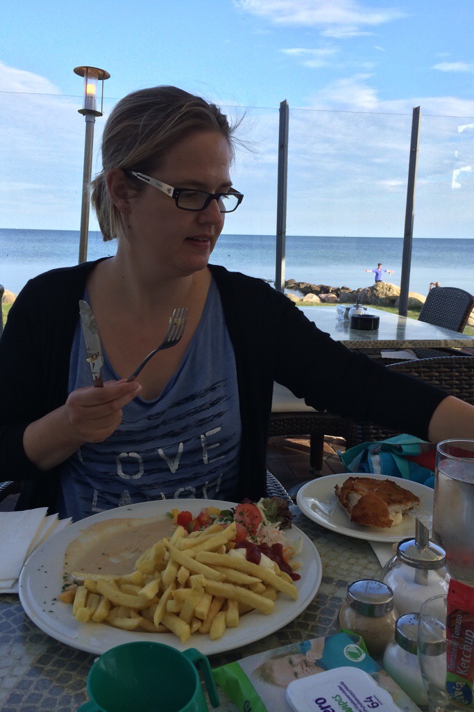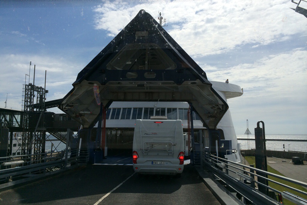 Kurz vor drei fahren wir weiter. In Rødby müssen wir auf eine Fähre, die uns nach Puttgarden übersetzt. Unser Navi spricht: „Noch 93 km dem Straßenverlauf folgen.“ Gleichzeitig sehe ich ein Schild „Rødby 58 km“. Sehr interessant. Anscheinend sieht das Navi die Fähre als ganz normale Straße an.