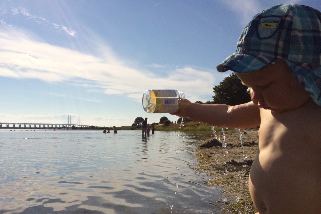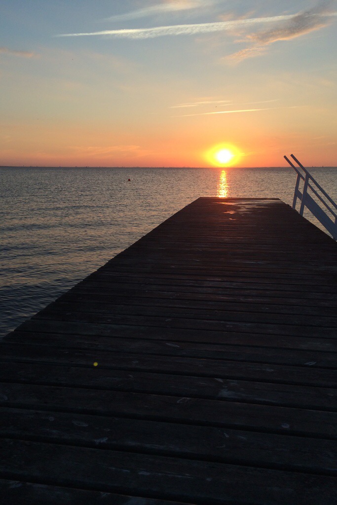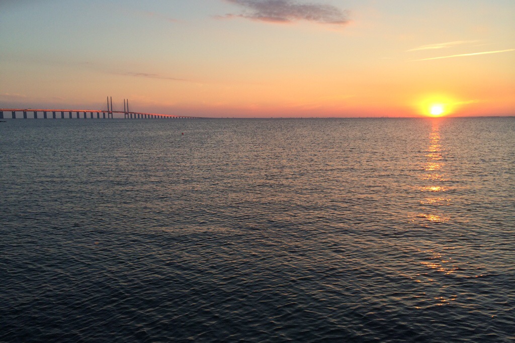 Was den Sonnenuntergang angeht, hatte ich recht. Nach dem Abendessen schnapp ich mir mein Bike und radle zum Meer. Die Sonne geht gerade unter. Kopenhagen glüht vor dem rot-gelben Himmel. Die Øresund-Brücke schimmert in Gold. Herrlich! Danke an Sabrina, dass sie am Camper sitzt und nach Kleini horcht.