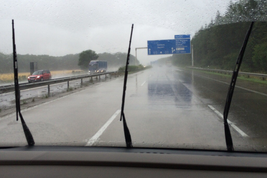 Gegen kurz nach zehn machen wir uns auf den Weg. Kaum sind wir von Fehmarn runter, fängst an zu regnen. Und zwar aus Kübeln. Ben Luis schläft kurz vor Lübeck ein. Keine Chance mehr, ihm zum Augen auf halten zu ermuntern. Ich bin gespannt, wie lange der Kleine diesmal schläft? Bis vor Hamburg? Oder schaffen wir es durch das Nadelöhr?
