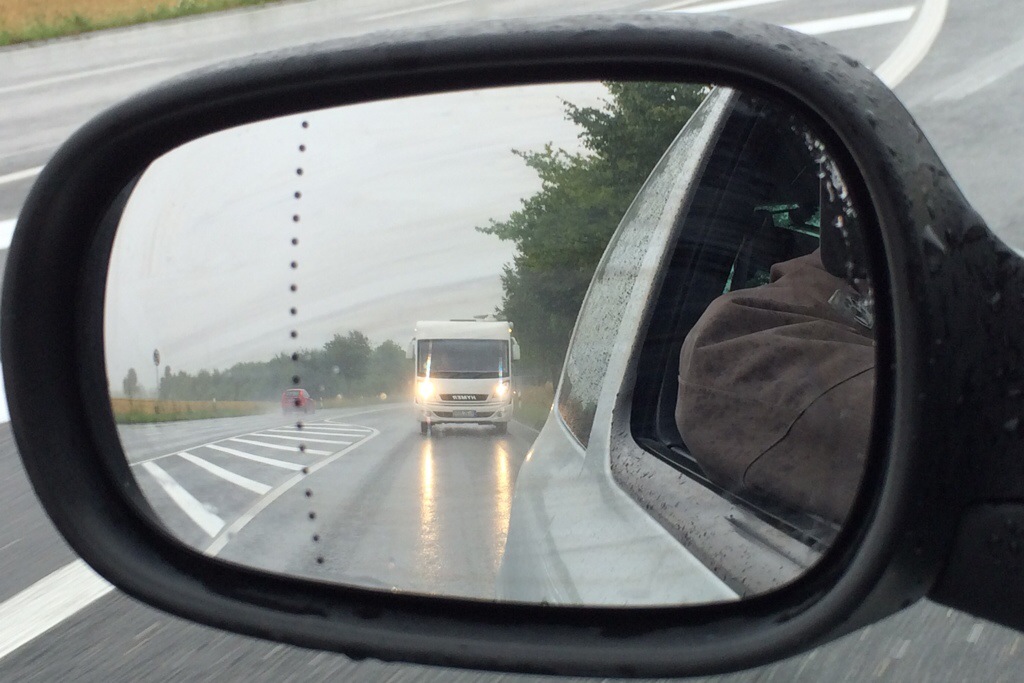 Ich fahre im Clio, den wir von meiner Mama für meine Elternzeit bekommen haben. Das erste mal sehe ich unser Hymermobil von vorne im Rückspiegel. Schon beeindruckend, unser Schiff.